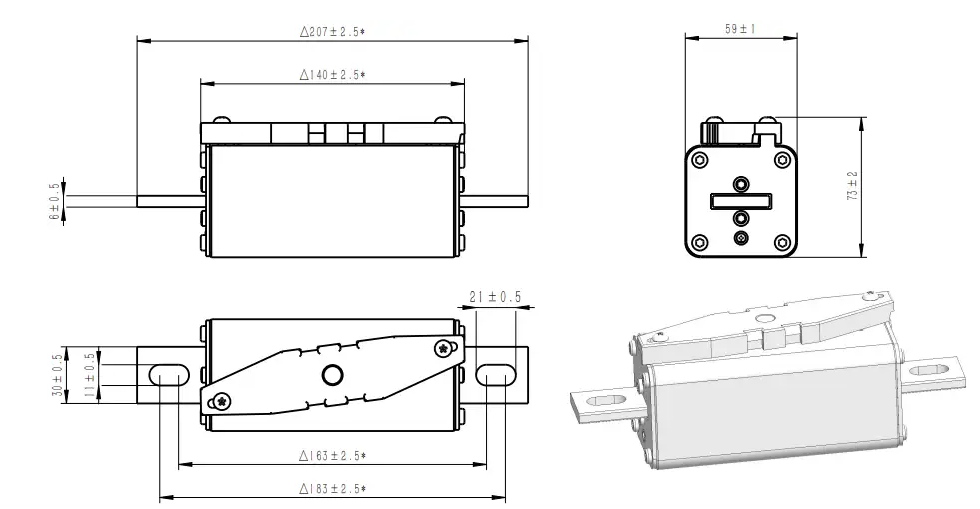 | Connect | Part No. | Fuse Amps | Average @250KA/1500Vdc | Power Loss (W) | Approvals | |||