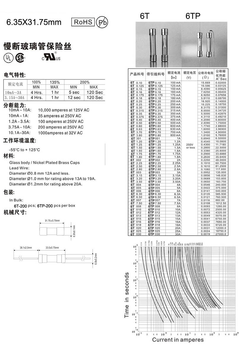 6.35X31.75mm slow break glass tube fuse