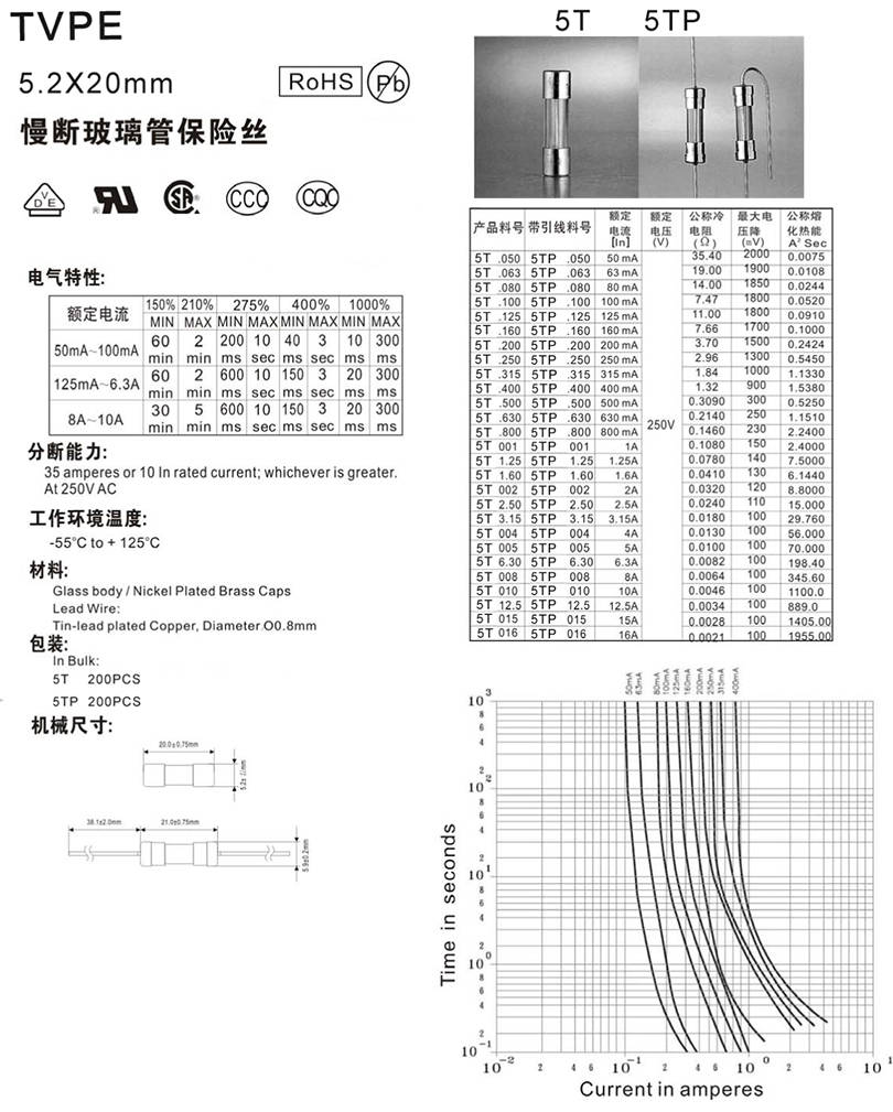 5.2X20mm glass slow burst fuse
