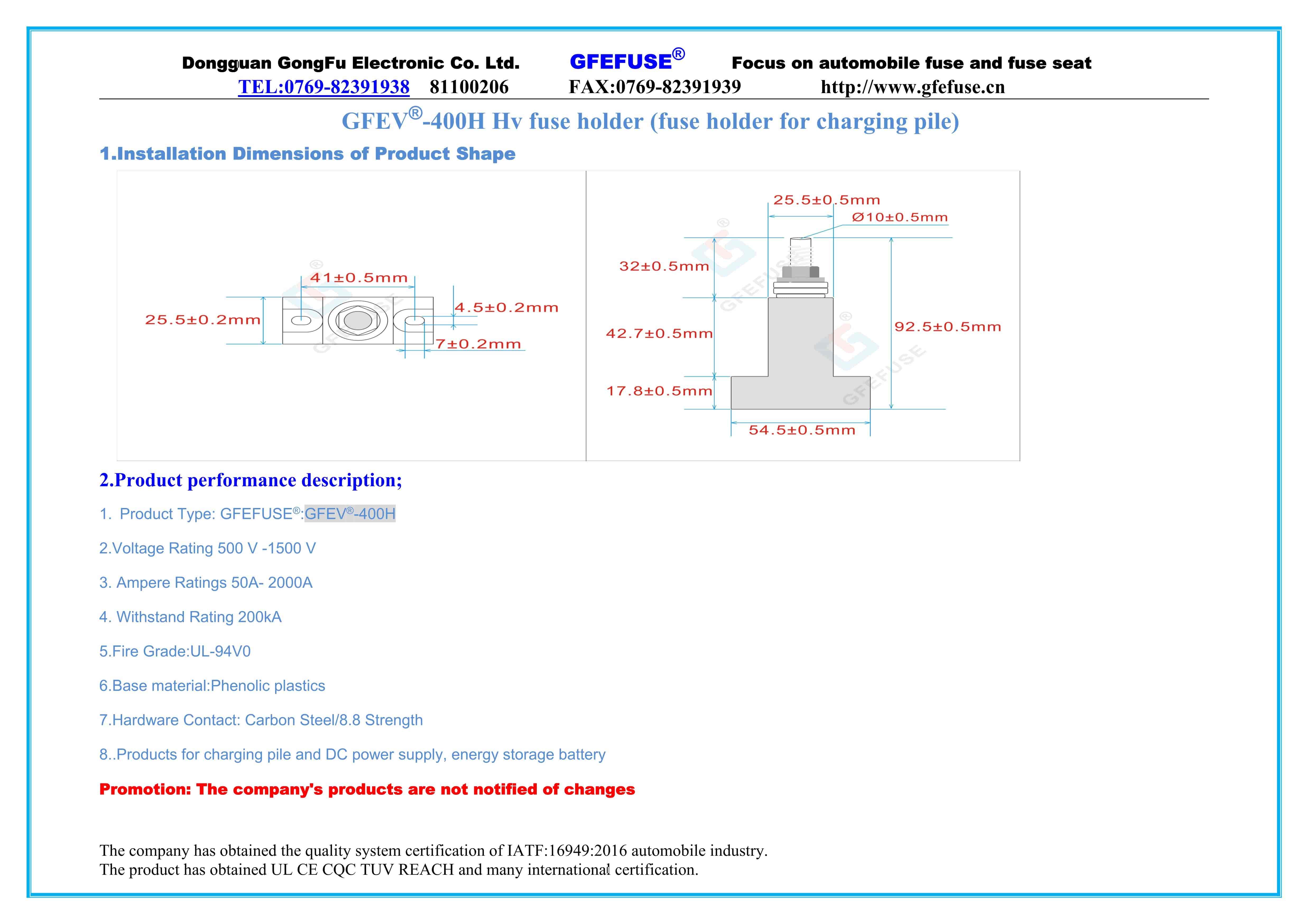 Dongguan Gongfu Electronics Co., Ltd. specializes in manufacturing and selling solar photovoltaic fuses, new energy vehicle fuses, miniature fuses, fork bolt fuses, car fuses, high voltage fuses, patch fuses, ceramic fuses, car fuse holders, car fuses, jump thermostats, car overload protectors,Fuse holder,Automotive insert fuse. Insert fuse holder, fork bolt fuse holder, fork bolt fuse box, bolt fuse, bolt fuse holder, low voltage fuse. DC fuse, DC fuse, car fuse, car fuse holder, etc. Products have passed UL CE CQC TUV REACH and other certifications. Customers are all over Guangdong, Jiangsu, Dongguan, Shanghai and other parts of the country.